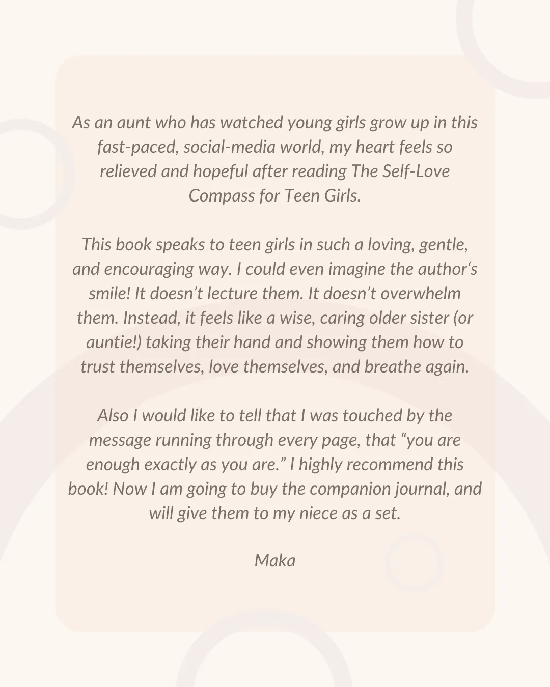 Now, I have the opportunity to share what I’ve learned with other teen girls - to offer tools, exercises, and gentle guidance that make this journey a little lighter and a little more manageable. I created spaces and resources where you can pause, reflect, and build the kind of self-love and confidence that doesn’t rely on comparison or approval from others. It’s not about doing it all at once or being perfect; it’s about giving yourself the chance to grow, day by day, at your own pace. And that’s exactly what I hope to provide for you here.